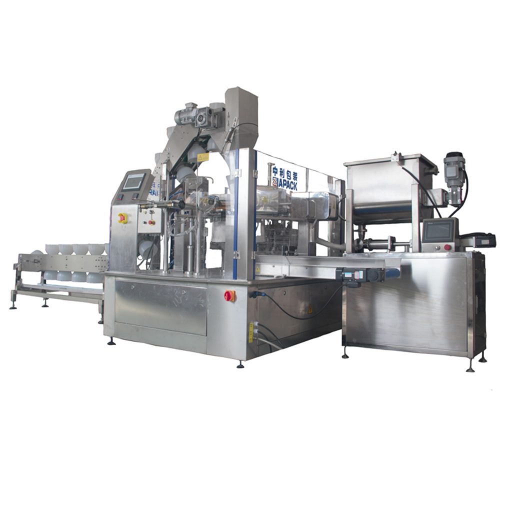 Эта машина предназначена для наполнения жидким продуктом, смешанным с твердым продуктом, например, предварительно приготовленными продуктами, такими как соленья с супом, маринованными оливками, маринованными огурцами и т. Д. С чашевым подъемником для подачи твердого продукта в готовый мешок, а затем наполнение поршневым насосом соус .