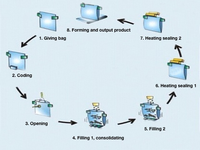 скорость 10-35 пакетов/мин (скорость зависит от состояния продукта и веса наполнения)) Вес 1400 кг 1520 кг 1580 кг 1650 кг вольтаж 380В 3 фазы 50Гц/60Гц Суммарная мощность 2KW 2.2kw 2,5кВт 2,5кВт Сжатие воздуха 0.8м3/мин (подача пользователем) 8бар Продукт Процесс