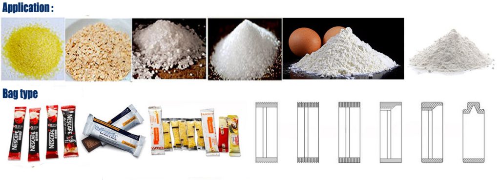 Эта машина в основном используется для упаковки порошковых продуктов: например, сухого молока, порошка сухого чая, порошка кофе, специй, порошка карри, порошка белка, приправы, растительного порошка, химических и медицинских порошковых продуктов.