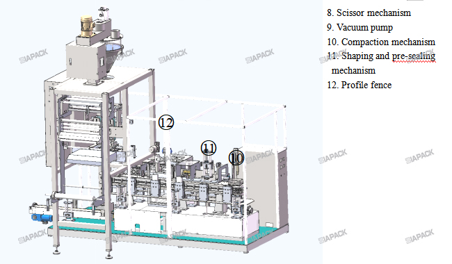 Формирование пакетов → сбор пакетов → резка → вибрация → формирование и предварительная запечатка → вакуумирование → сброс и толкание пакетов → доставка готовой продукции